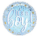 17" packaged round Helium Saver with white border with gold and blue stars. A light blue circle in the center with the message "It's a boy!"