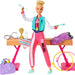 Includes gymnastic training environment with Barbie® Gymnast doll in a metallic leotard and these additional accessories: extra leotard, a warmup suit, extra shoes, towel, snacks and a gym bag.