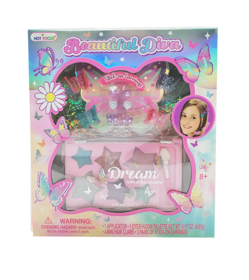 Hot Focus Beautiful Diva Tie Dye Butterfly Eyeshadow & Hair Claw Set includes one eyeshadow pallet, 4 mini hair claw and 3 pairs of stick-on ea...